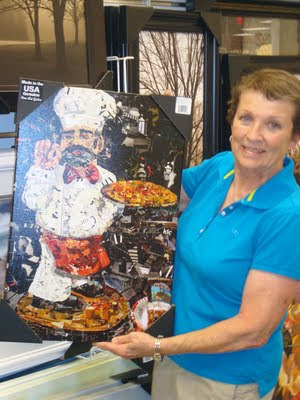 Okay Suzy...here ya go. This is what I found at Kohl's. Took one alone and one with yours truly to show the size of the painting...snag whichever you'd like. Sorry about the glare on my photograph. The photo was taken by one of the dept managers and he said that he was thrilled to know the artist as they don't usually know anything about them. Of course, I did have to give him a little history. There were only 2 there...they've already sold 1 as the manager said they start out with 3 or 6(on smaller paintings). They are located in the picture and home decor section in our Tyler store...and he looks great as he's more colorful than most of the offerings. They're listed at $69.95 which is a great price for something that large...YIPPEE...you go girl!!